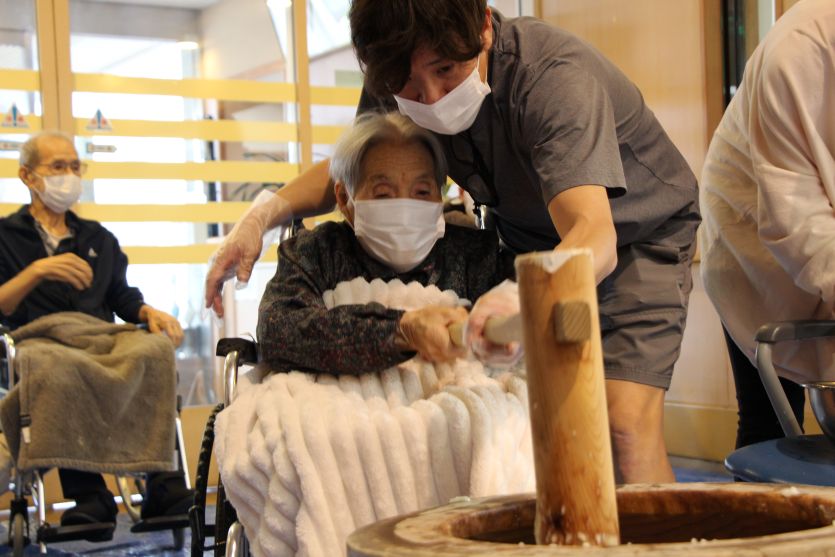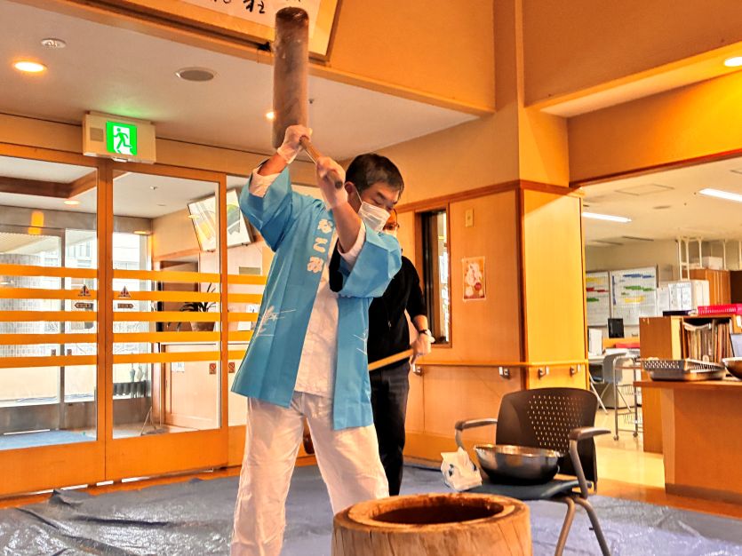 ご利用者様にも杵をもっていただき、もちつきをしていただきました。