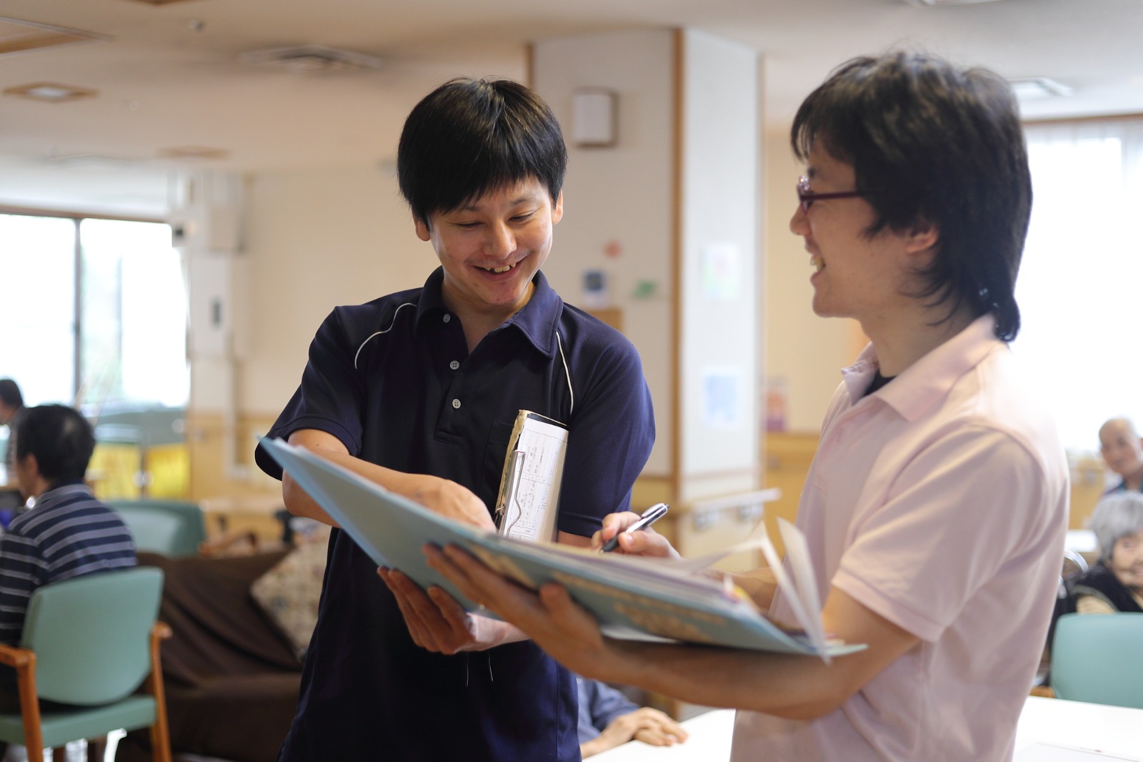 仕事をしていて楽しいと思う事は入居者様との関わりです。はじめはその入居者様のことが何もわからないですが、入居者様に寄り添いその方のことを知っていくことで、今まで「できない」と思っていたことが関わり方を変えることや支援を工夫することでご本人の力で「できる」ことがわかり、できることが増えていくことが楽しいと思います。私たちが関わることで直接感謝の言葉をいただけることはとても嬉しくやりがいを感じます。また、ご家族にもそのことを報告させていただくと喜んでくださることが嬉しく思います。