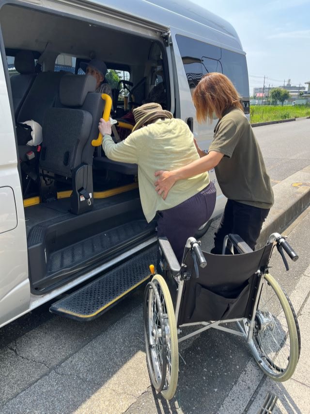 普段車椅子を使用されていても、足の力がある方には座席に座って頂く為に職員がお手伝いします。