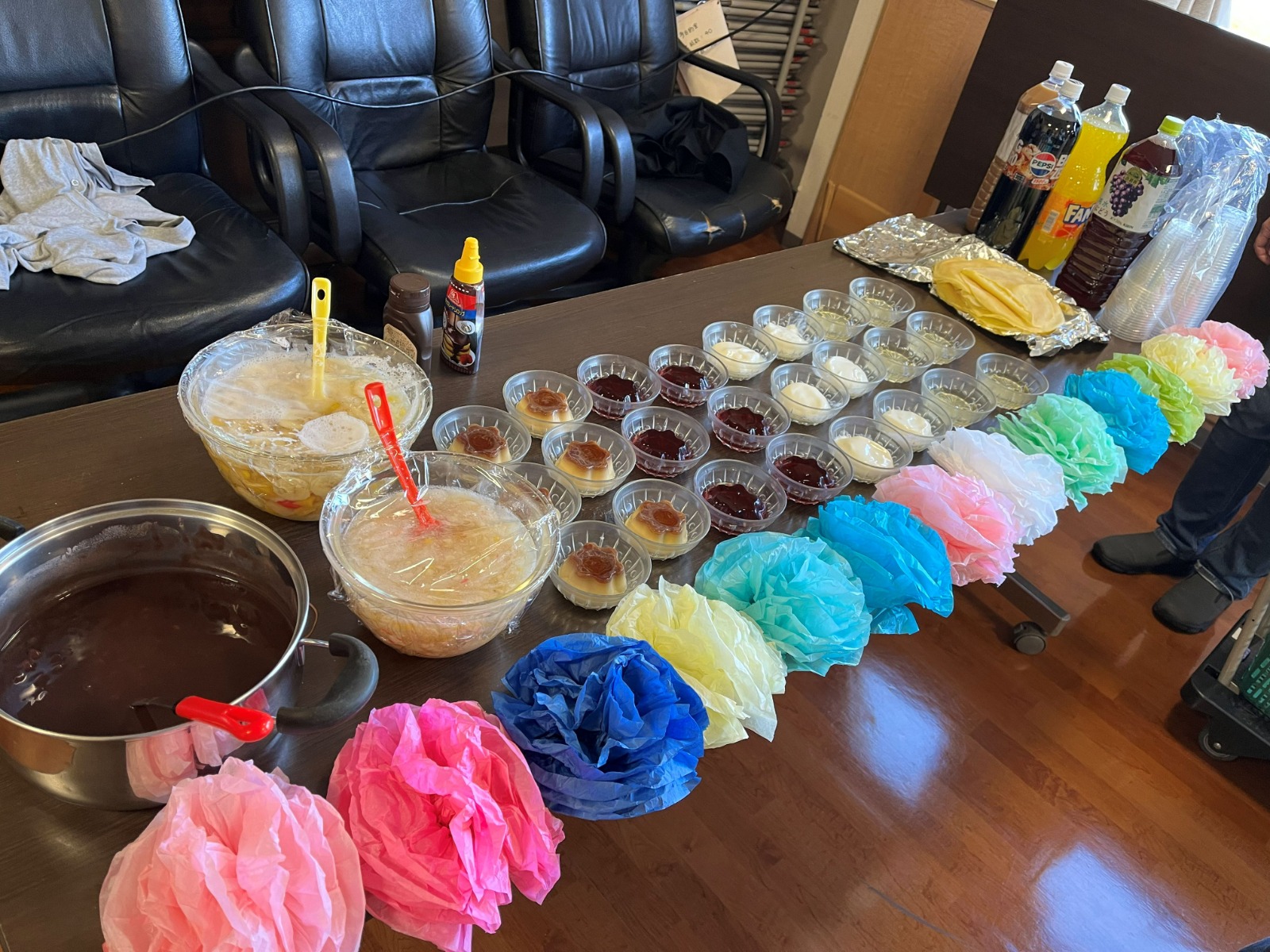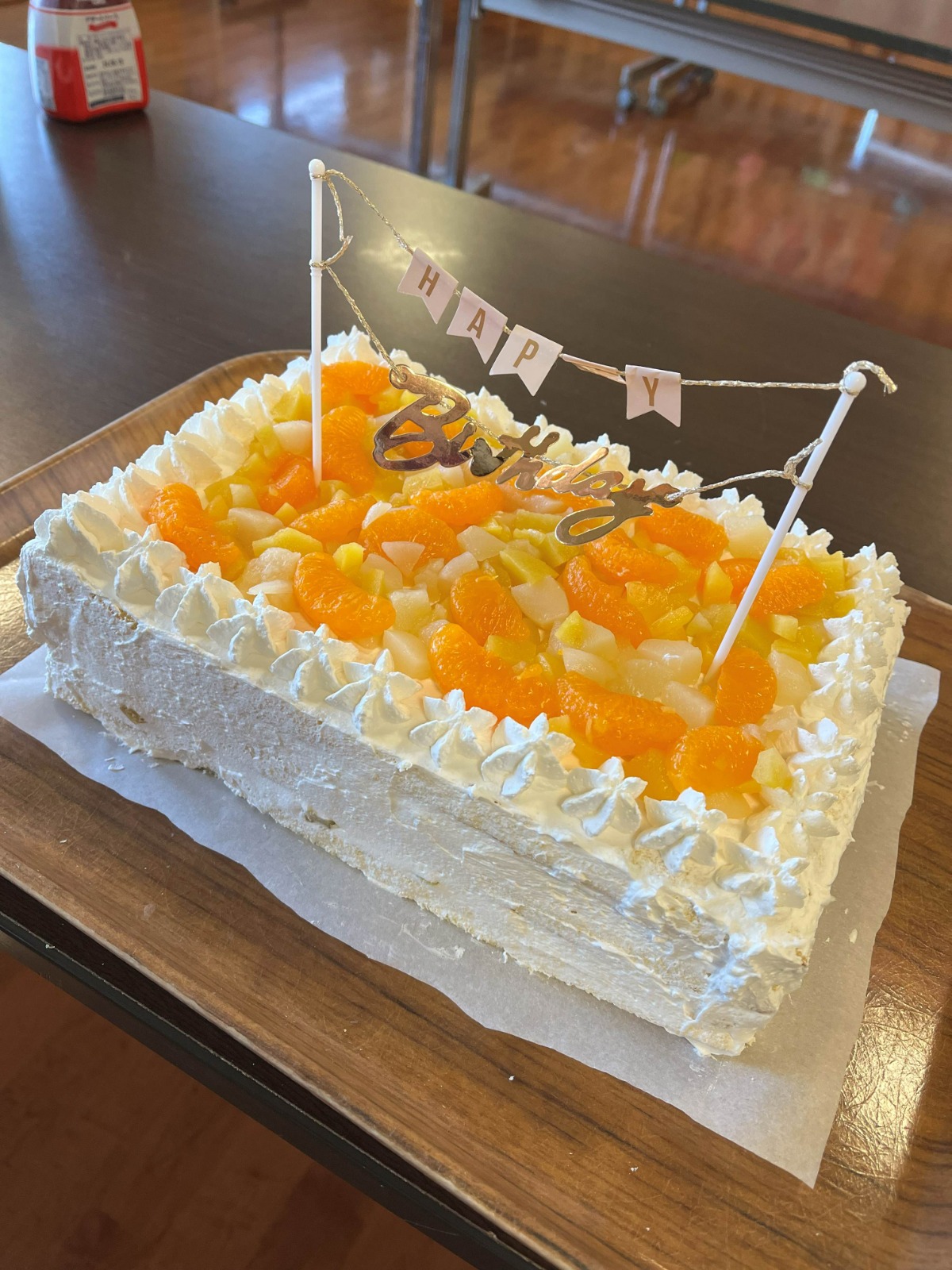 メニューは、メインの誕生日ケーキ、クレープ、フルーツポンチ、お汁粉、プリン、ゼリー、ヨーグルトです。