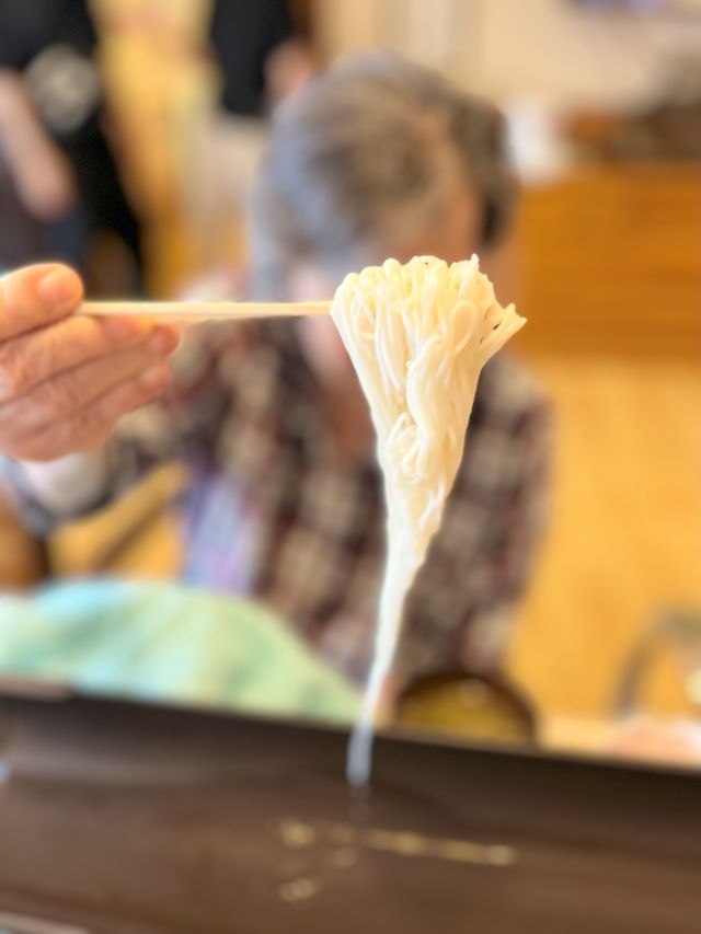 流れるそうめんを箸でキャッチして食べるそうめんは、子供からお年寄りまで楽しめます。キャッチしたそうめんは、その場でおいしく頂きました(^^♪