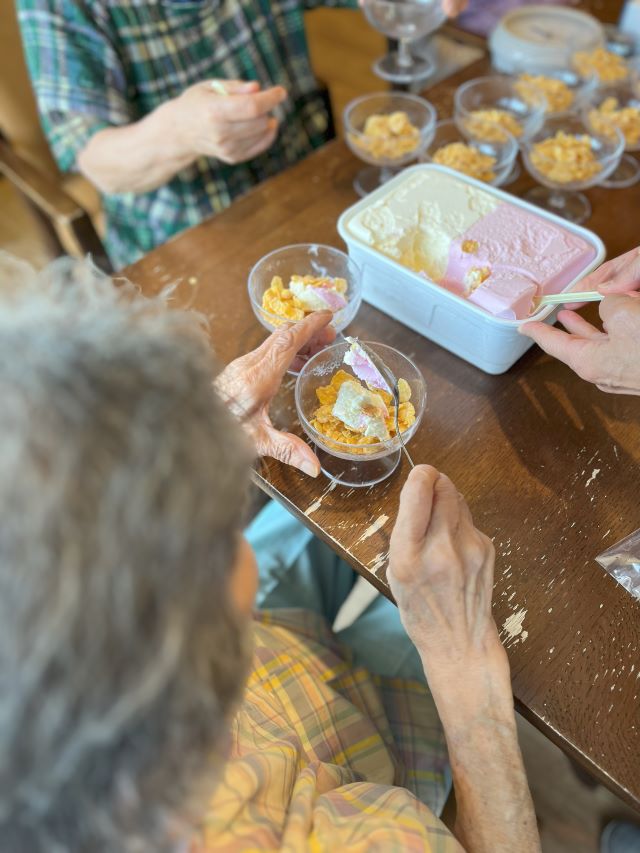 みんなで、コンフレークの上にアイスや生クリームをのせてチョコソースやカラフルチョコで
