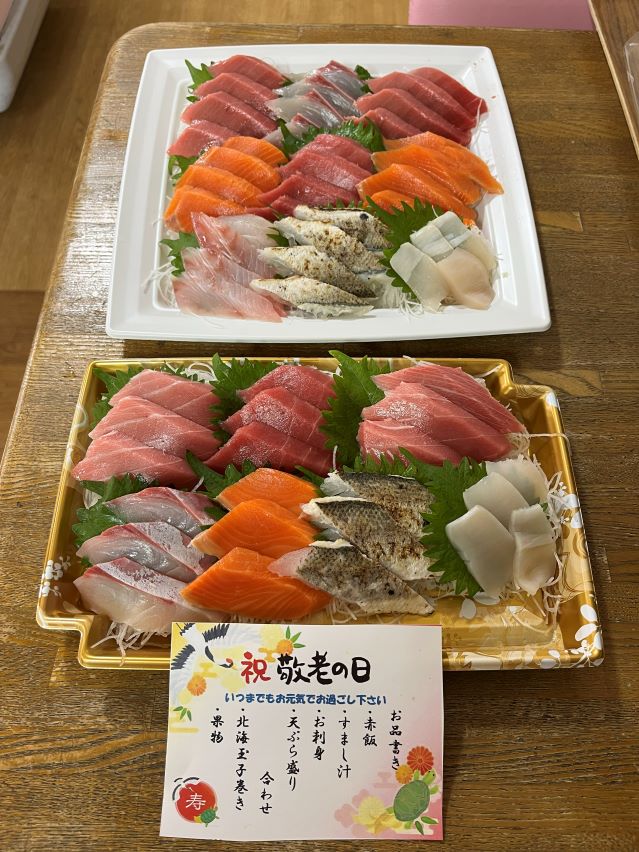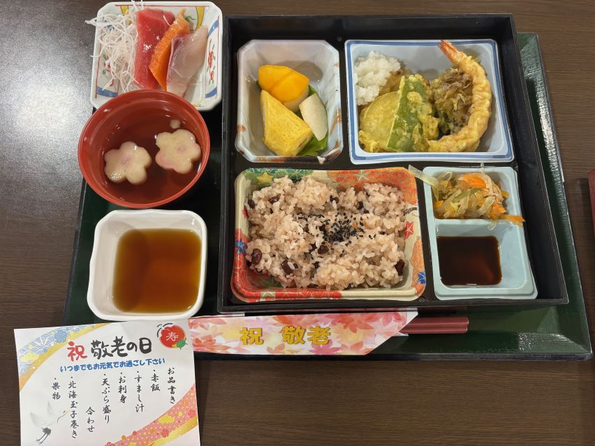 赤飯に天ぷら、お刺身もあり、とても豪華なお食事で皆様、大変喜んでおられました。