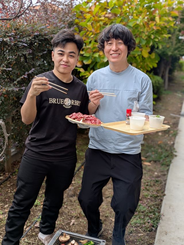 10月29日に入職した、左に写っているのは技能実習生のグエン・マイン・クオンさんも初めての炭火焼に参加しました!!一緒に写っているいるのは、クオンさんの生活指導員の木村さんです↓↓
