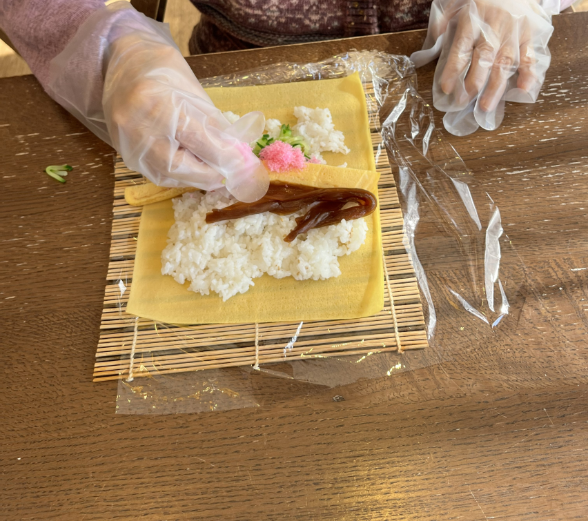 海苔の上にご飯を広げ、具材をのせて皆さんで巻いていきました。