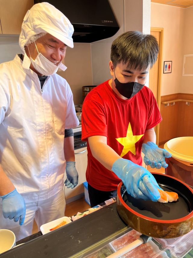 ユニットにいる技能実習生のクオンさんもお寿司作りを体験してみました!!