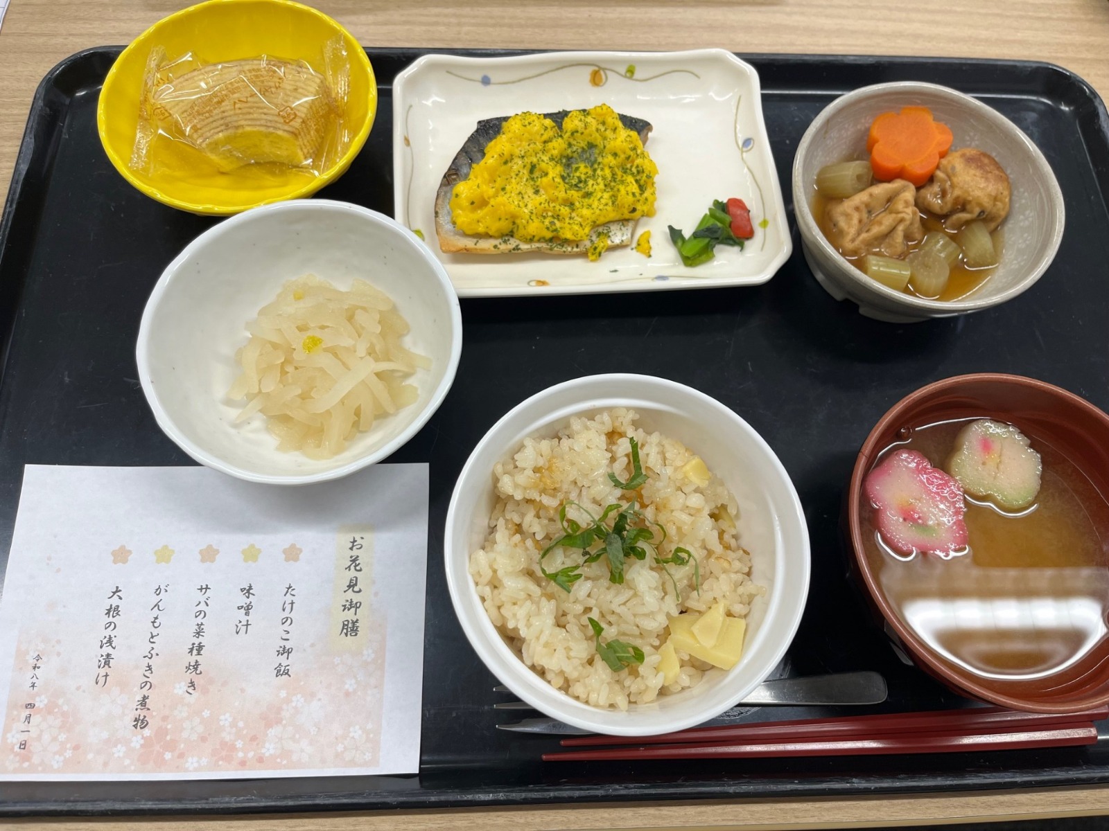 かんなみの杜のサバはとても脂がのっていて、ご入居者様に好評です。そのサバに炒り卵をのせて春らしい彩りをくわえました。旬のたけのこやふきも使用し、春らしい献立になりました。