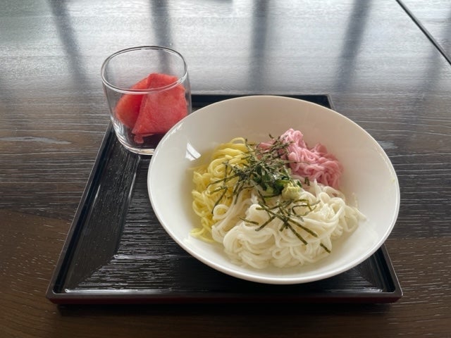 七夕の今日、お昼に3色そうめんとスイカを提供させていただきました。